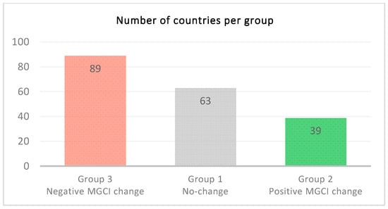 Number of countries experiencing negative, positive, or no change in MGCI from 2015 to 2018.