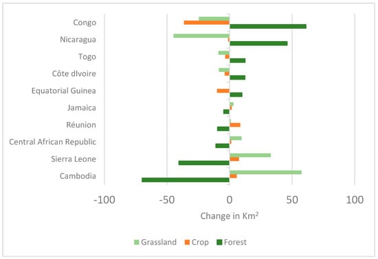 - Group one included countries (63) which experienced no significant absolute or relative changes in the MGCI during the period 2015–2018. Of these, forest cover increased mostly in Equatorial Guinea (+9 Km2), Côte D’Ivoire (+12.33 Km2), Togo (+12.44 Km2), Nicaragua (+45 Km2), and Republic of the Congo (+61 Km2). Expansion of forest cover was mainly counterbalanced by contraction of cropland in Congo and Equatorial Guinea and mainly of grassland in Nicaragua, Togo, and Côte d’Ivoire, as shown in Figure 7.