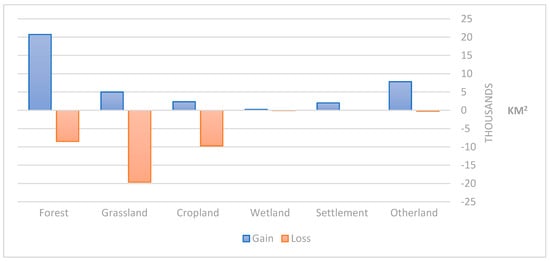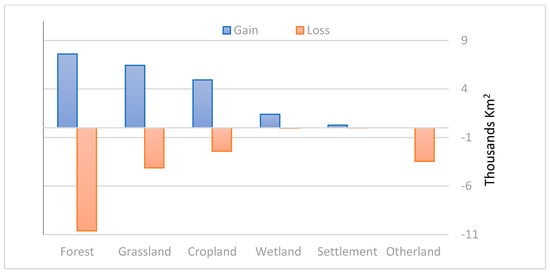 Figure 10. Gain and loss of land cover classes in mountain areas in countries where MGCI decreased from 2015 to 2018.