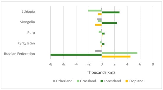Figure 8. Total gains and losses of land cover in mountain area per class in countries where MGCI increased from 2015 to 2018. - Between 2015 and 2018, the Russian Federation lost 10185 Km2 of forest cover in mountain areas, accounting for a 96% net loss for group 2. It gained 5560 Km2 and 4494 Km2 of grassland and cropland, respectively. However, these figures should be interpreted with caution as forest cover is often affected by factors that do not result in a permanent land cover/land use change. These factors include fires, other natural or anthropogenic disturbances, and forest management. In fact, it has been recently reported that forest fires explained 50–60% of tree cover loss in boreal forests from 2003–2018 [].The four largest forest cover gains occurred in Ethiopia (2772 Km2), Mongolia (2347 Km2), Peru (433 Km2), and Kyrgyzstan (414 Km2), together accounting for 80% of the total forest mountain cover net gain of the group. Figure 9 illustrates the land cover changes in the five countries.