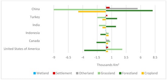The United States, Canada, and Indonesia suffered a loss of forest cover (−3720 Km2, −1592 Km2, and −919 Km2, respectively). In Indonesia, the loss of forest cover was compensated by an increase in cropland and grassland cover. In Canada, the forest cover loss was compensated by increases in grassland cover (44%), cropland cover (21%), and by expansion of other land (34%). In the United States, three quarters of the forest cover lost was taken by the expansion of grassland, whereas 9% was taken by expanding cropland. The residual area was taken by the expansion of settlements (9%), other land (5%), and wetland (2%) cover. Again, the changes from forest cover to other green cover classes should be interpreted with care as they do not necessarily reflect permanent cover changes.