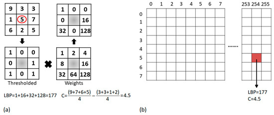 - Texture characterisation. Texture is locally sampled by the joint distribution of two properties associated with pixels: (i) Local Binary Pattern (LBP) and (ii) a contrast measure (C). LBP is a simple yet very efficient local texture operator capable of characterizing small texture regions [39]. Figure 1a shows the procedure for computing LBP values. After comparing each central pixel with its eight neighbors, the 3 × 3 neighborhood generated must be thresholded by the value of the centre pixel. Thus, the neighbors having a smaller value than the central pixel have bit 0, and the other neighbors having a value equal to or greater than that of the central pixel have bit 1. Then, these binary values of the pixels in the thresholded neighborhood must be multiplied by the weights given to the corresponding pixels. Finally, the values of the eight pixels are added to obtain a number for this neighborhood. With regard to the employed C, its compute is also addressed in Figure 1a.