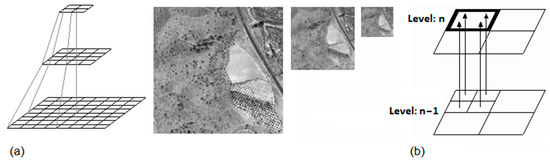 - Hierarchical structure generation. A pyramidal representation was adapted to texture segmentation (Figure 2). A pyramidal architecture is completely defined if we specify how a new level is built (Figure 2a) and how a parent is linked to its children (Figure 2b). In our case, the LBP/C distribution of the grid cells formed the base of this pyramidal structure, and each level l of the pyramid was a reduced map with one-fourth of the cells of the level immediately below. Each pyramid cell, denoted by (x, y, l), had the following parameters associated with it: