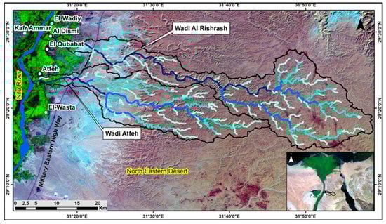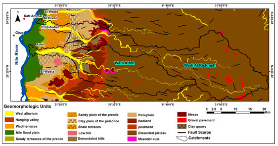 The development of the Nile River in Egypt has been controlled by the Red Sea rifting during the Oligo–Miocene, where the initiated rift-related graben between the Eastern and the Western Deserts accommodated the Nile floodplain [9,34,35,36]. Consequently, the elevated Eocene limestone plateau in the north Eastern Desert of Egypt has been incised by numerous wadis that drain this plateau into the Nile River [8]. The Nile Valley between the Beni Suef Governorate and the Greater Cairo (i.e., the study area; Figure 1) is one of the key heavily populated areas in Egypt. The availability of land parcels suitable for urban growth has become very limited. As a result, the alluvial plains and nearby foot slopes of the eastern limestone plateau has been targeted for different anthropogenic activities. The development of the Nile River through sets of distinctive phases of evolution (i.e., the Paleonile, the Protonile, and the Prenile) as well as the water discharge from catchments draining the surrounding plateau has contributed to the accumulation of groundwater, fertile soil and building raw materials. The catchments of Wadi Al Rishrash and Atfeh drain approximately 618 km2 and 428 km2 of the plateau and ends into the Nile River at cities of El Wadiy and Atfeh respectively (Figure 1). New agricultural areas have been reclaimed on the expense of the fertile soil of the Prenile and the Paleonile. Most of the new cultivations are being irrigated from the Nile via sets of pumping stations and networks of pipes and canals. Due to the proximity of the study area to Greater Cairo and its nearby new urban communities, the quarrying of raw materials (i.e., sand, aggregates, and clays) has become one of the main activities. The extraction of these raw materials has created significant changes in the landscape, where large man-made depressions and dump sites are now dotting the area [4]. Most of these depressions are filled with waste water that could negatively affect the surrounding anthropogenic activities as well as the environment.