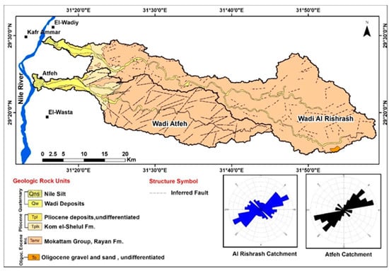 Geological map of the Wadi Al Rishrash and Wadi Atfeh catchments and an inset of the rose diagram showing the dominant structural orientations in the study area, modified after Klitzsch et al. [38].
