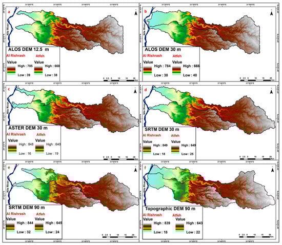 Examples of different DEMs sources used in hydrological analysis of Wadi Al Rishrash and Wadi Atfeh catchments including (a): ALOS DEM (12.5 m resolution), (b): ALOS DEM (30 m resolution), (c): ASTER DEM (30 m resolution), (d): SRTM DEM (30 m resolution), (e): SRTM DEM (90 m resolution) and (f): topographic map-derived DEM (90 m resolution).