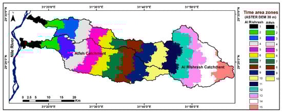 ArcHydro is a GIS toolbox for hydrographic analysis, which provides the basis for hydrological data modelling [39]. The different datasets and layers have been co-registered and projected into WGS UTM zone 36, datum 1984. Each of these DEMs has been processed following the standard steps in ArcGIS 10.3 software in order to compute the GIS-spatially distributed unit hydrograph for the two catchments from a uniform storm with an effective rainfall depth of 10 mm. This value represents the minimum streamflow initiation threshold in the Sahara as determined from field measurements and was widely used for flash-flood assessment in desert environments [23]. This hypothetical uniform rainstorm event was preferably selected over using historical records of rainfall events in the Eastern desert of Egypt due to the absence of continuous gauges in these desert watersheds and the extreme variability of the rainfall events in time and space [23,40]. In order to compute the hydrographs, several steps are involved in a GIS environment that include the subdivision of catchments into cascading zones and estimation of the effective discharge of each zone on time graphs.