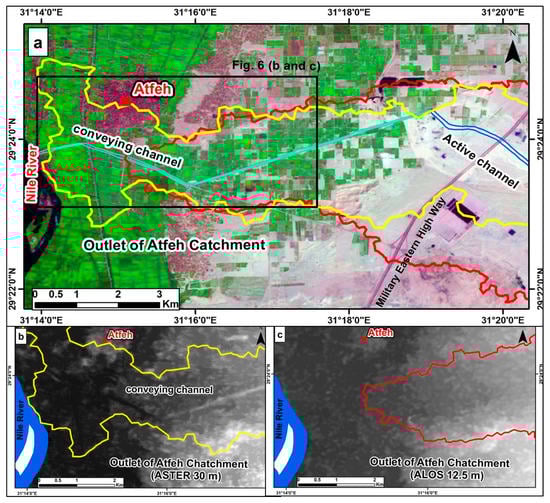 (a) Landsat 8 image of the outlet of Atfeh catchment showing the catchment boundary from different DEM sources (ASTER DEM in yellow and ALOS DEM in red) as well as the conveying channel. The relief signature of the man-made conveying channel can be recognized only on the ASTER DEM of 30 m resolution (b) but not on the ALOS DEM 12.5 m resolution (c). Note that the automatic extraction of the catchment boundary using ALOS DEM yielded a smaller catchment compared to the one derived from the ASTER DEM, where the catchment outlet on the former DEM occur at ~1.5 km away from the Nile River compared to reaching the Nile River on the later (refer to Figure 4 for a regional overview of the two catchments).