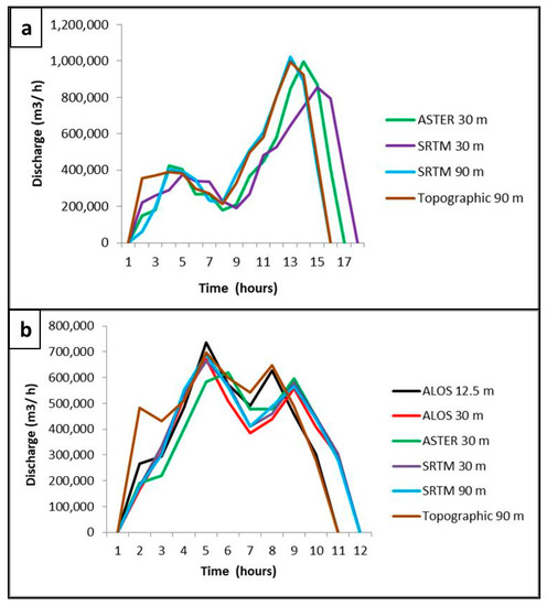 The quantitative indices of the two drainage catchments have been estimated from the hydrographs (Figure 7) and were summarized in Table 1. For example, the time to peak represents the required time to attain the highest discharge and the total flow duration indicates the entire length of time required to discharge all the flash-flood out of the catchment outlet. Inspection of these parameters indicates a high similarity between the outputs of different DEM sources and are approximately consistent with wadis and alluvium extent on the satellite images. Moreover, the estimated unit hydrographs from a 10 mm effective rainfall uniformly distributed in one hour over the entire time-area zones are highly correlated (Figure 7). For example, the unit hydrographs for the Atfeh catchment ranges in total flow duration from 10 to 12 h and the peak discharge rate vary from 89 m3/s (SRTM 30 m) to 102 m3/s for the ALOS DEM. The time-to-peak occurs in the fourth hour in all data sets except in the ASTER 30 m DEM, which produced a peak discharge in the third hour. The SRTM DEMs appears to produce the modest slope and gradient as the catchment has been subdivided into large numbers of cascading time-zones.