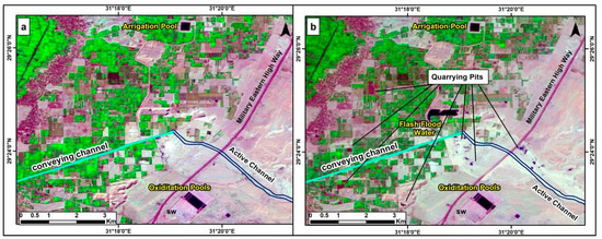 Multi-temporal Landsat 8 image close-up on the outlet of Wadi Atfeh catchment before (a) and after (b) the flash-flood event of 13 March 2020 showing the water accumulation in quarrying pits.