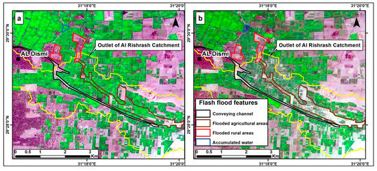 Multi-temporal Landsat 8 image close-up on the outlet of Wadi Al Rishrash catchment before (a) and after (b) the flash-flood event of 13 March 2020 showing the overflooding of the conveying channel, drowning of the agricultural lands, flooding of villages and urban areas and accumulation of water ponds.