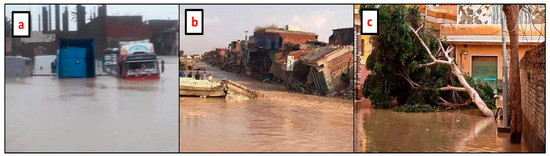 The extent and magnitudes of the flash-flood event of 13 March 2020 were highly variable among the different drainage basins. This variability sheds light on the importance of understanding the controlling physical processes and anthropogenic activities on flash floods, which are needed to alleviate their adverse environmental and societal impacts. Inspection of multi-temporal Landsat 8 images before and after the March 2020 flash-flood event in the two catchments (Figure 8 and Figure 9) together with filed observations indicates that: (1) the alluvial plains, which are liable to occasional flash flooding, have been reclaimed for agricultural activities, encroached by rural and urban areas, and locally exploited for quarrying for raw and building materials. (2) The culverts underneath the Eastern Military Road are of insufficient capacity to discharge the peak flows. Thus, the road at its intersections with the main wadi is vulnerable to accumulation of runoff and flooding. The destruction of the road section in Wadi Al Rishrash during the 13th of March event drifted several vehicles with serious causalities and life losses (Figure 10). (3) The conveying channels west of the Military road have been breached by overflows during the last flash floods, thus the agricultural fields has been flooded, and the near-by open pit quarries have also received considerable amount from the flash flooding (Figure 8 and Figure 9), and (4) the villages in the Nile Valley have been affected by the flash floods, and Al Dismi has been severely affected by the flash-flood from Wadi Al Rishrash, where buildings in the wadi floor were flooded and several houses on the wadi banks collapsed due to erosion of the bank sediments underneath (Figure 10).