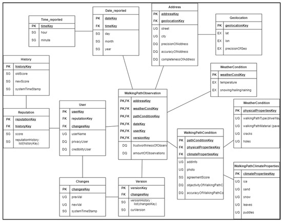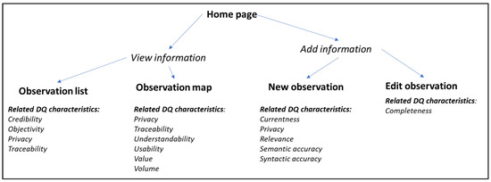Improving data quality based on the data model is not a new idea [6,32,46,59]. This research aims to improve data and information quality by integrating quality characteristics into the citizen science platform’s design, mainly focusing on the data model and user interface. Improving the data model is presented as an excellent option to enhance data quality, while processes that add or modify the data should be examined and improved [46]. Data quality characteristics can be considered constraints for the data model and the platform’s user interface during the design stage.