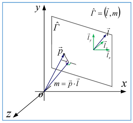 Traditionally, a plane is represented by the normal vector and any one point lying on it. Since the selection of the point is random, there is more than one representation for a single plane, which makes it difficult to compare and determine the difference between two planes. To ensure the unique representation of a plane in three-dimensional space, a quad tuple-based representation method was employed, as shown in Figure 3, in which a plane can be represented as a quad tuple , as shown in Equation (1):
