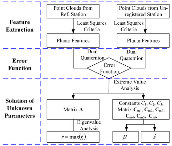 As in Figure 4, the given point clouds from the two neighboring LiDAR stations, namely the reference station and the unregistered station, suppose that and represent the two pairs of conjugate planar features separately extracted from them, where and are quaternion-based representations corresponding to and . In the implementation of the proposed algorithm, the following steps are suggested to obtain the seven unknown parameters: