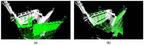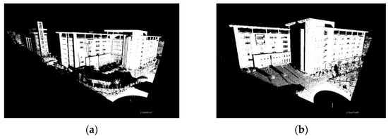 Acquired point clouds of the same building from two different LiDAR stations. (a) The point cloud from the reference station; (b) the point cloud from the unregistered station.
