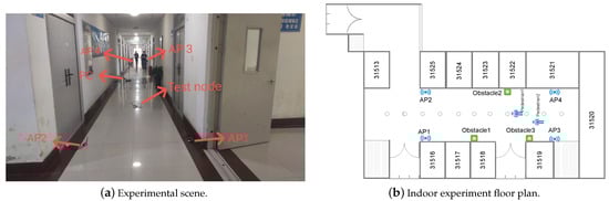 The actual indoor scene is shown in Figure 1. We use a CC2530-based Zigbee indoor positioning system to test the signal strength from unknown nodes to known nodes and analyze its noise characteristics. The experimental scene shown in Figure 1a is the corridor on the fifth floor of the experimental building of Henan University of Technology. There are obstacles and moving pedestrians in the corridor. The tested CC2530-based Zigbee indoor positioning system has a coordinator, a test node, and four APs. The test node and the PC are connected through a coordinator. The four APs are AP1, AP2, AP3, and AP4; they are distributed as shown in Figure 1 and the coordinates of the APs have been determined. They are known nodes and can be used as the transmitter and receiver of wireless signals. The test node is a mobile unknown node. The signal strength of other nodes received by the test node is transmitted to the coordinator, the coordinator node is connected with the computer, the coordinator then transmits the received data to the computer, the computer stores the data, and then calculates and determines the coordinates of the test node. In the test experiment, the unknown node is resting state, the signal strength data is collected by PC at rest for 3 min for each node each time, and 50 sets of data are selected among them. The data sets are checked and analyzed for the error distribution characteristics of four APs signals received by unknown nodes.