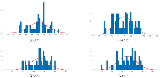 The experimental results of the tests are shown in Figure 2. With the experimental results of the Kolmogorov–Smirnov [33,34,35,36] test analysis, if the test rejects the null hypothesis at significant level, the signal strengths from the unknown nodes to the four APs have a non-Gaussian distribution.