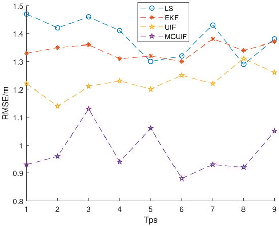 In the experimental positioning scenario shown in Figure 1, we randomly selected 9 Testing Nodes (TNs) and placed the positioning tags at TNs in turn for 2 min, collected the signal strength data, and used different positioning algorithms of LS, EKF, UIF, and MCUIF to calculate the positioning coordinates of each reference node; the path dynamic attenuation index is . In the LS, EKF, and UIF algorithms, assume that the observed noise is Gaussian noise conforming to the normal distribution, and set the observed noise variance . The positioning accuracy is measured by the Root Mean Square Error (RMSE) of each reference node: