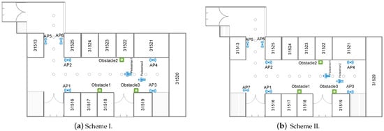 There are many corners in the teaching building, and we have done experimental analysis specifically for the corners. The test results show that the placement of the AP at the corner is closely related to its positioning accuracy. For Scheme I, we placed APs as shown in Figure 4a; the AP1-4 placed on one side of the corridor corner remained unchanged, and two APs were placed on the other side of the corridor corner: AP5 and AP6; Scheme II, as shown in Figure 4b, AP1-6 is placed in the same location as in scheme I, we add AP7 at the key points of the corner, and the positioning accuracy is significantly improved. The RMSE of its positioning is shown in Table 3. As shown in Table 3, at the curve, in the second scheme, the performance of the four algorithms of LS, EKF, UIF and MCUIF has been significantly improved. Four points were selected for testing before and after the corner, a total of 8 points, the average mean square error of the test results is shown in Table 3. The average error of the UIF algorithm and the MCUIF algorithm of scheme II and scheme I is also reduced and , respectively.