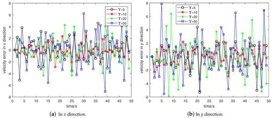 Based on the analysis of the above simulation experiments, Figure 6 shows the comparison of the dynamic positioning of the MCUIF algorithm in the four kernel bandwidths, and Figure 7 is the comparison of the positioning RMSE in the four kernel bandwidths. Figure 8a is the velocity estimation error of the unknown nodes in the x direction, and Figure 8b is the velocity estimation error of the unknown node in the y direction.