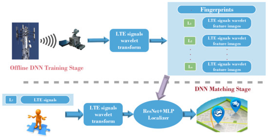 Signal-based fingerprint positioning technology has numerous advantages over distance-based methods. First, most fingerprint-based technologies do not require additional hardware or infrastructure. The main requirement for this technology is a fingerprint collector, such as a smartphone or signal receiver. Second, it can be applied to large-scale LBS. Finally, it draws less energy from the UE [5]. The features of environmental signals are matched as signatures with predefined geotag signatures. Based on fingerprint positioning, we apply them to outdoor environments. Fingerprint-based positioning technology includes an offline training stage and an online matching stage. As shown in Figure 1, in the offline stage, the geotag signal features of the LTE BS are collected. Then wavelet transform is used to convert the LTE signal to wavelet feature images to build a fingerprint database of places of interest. In the matching stage, the captured signal wavelet feature image is matched with the fingerprint database to determine the location of UE [6].