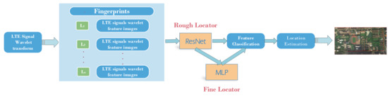 However, the main problem with fingerprint-based precise positioning technology comes from signal fluctuations, such as multipath fading or signal propagation being blocked by trees, buildings, or moving cars [5]. These adverse factors will lead to poor positioning accuracy. Considering the principle and positioning process of the fingerprint positioning system, to maximize positioning accuracy, the problem to be solved in this paper is how to extract LTE signal features, and how to develop a classifier with powerful learning abilities. To extract reliable signal features, the wavelet transform method is used to calculate the wavelet feature coefficient and uses the wavelet coefficient feature images to store the extracted signal wavelet features. To extract high-value features from large amounts of data, the human information processing mechanism proposes using a multilayer deep learning algorithm to deal with this problem [13]. It has been shown that DNN models can extract and learn high-level features whenever we feed them with a large-scale dataset, especially in the fields of computer vision and feature fusion [14]. However, the technique of using deep neural networks (DNN) to implement computer vision based on LTE signals for outdoor positioning has not been perfected. Aiming at this problem, an LTE signal fingerprint positioning technique is proposed based on wavelet transform and deep learning. The area of interest is classified into dozens or hundreds of grids, and each grid is treated as one category. Therefore, the positioning issue is transformed into a classification issue. To solve the aforementioned problems, the ideas of deep learning, transfer learning, and wavelet analysis were leveraged to achieve high-precision outdoor positioning. After building the wavelet image fingerprint dataset, first, we randomized it, then used the first 60% of the dataset as the training set, the middle 20% of the database as the validation set, and the last 20% of the dataset as the test set. The results of the test set were used to indicate the positioning accuracy. In offline training, an improved deep residual network (ResNet) containing multiple residual units and multilayer perceptron (MLP) was used. After completing the training, a ResNet-based rough locator can be obtained. Furthermore, inspired by the idea of transfer learning, the MLP-based fine locator uses prior knowledge gained from ResNet to achieve higher-level positioning performance. This method has several advantages. First, ResNet can learn high-value features from a massive number of LTE signals with large fluctuations. Second, the DNN-based location predictor is more robust because it uses the trained ResNet information to predict the position. Also, the positioning system proposed in this paper can handle large-scale LTE signal datasets. The prediction at the matching stage does not require any search in the sample space, only the forward evaluation of the trained DNN. The proposed positioning system is shown in Figure 1.