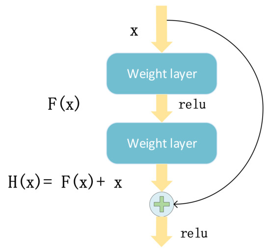 Assume the function of the target neural network fits , and the stacked nonlinear network is fitted with . The original mapping is . The hypothesis is that is very complex, neural networks cannot effectively extract reliable features, and the residual module is much easier. The residual module consists of two parts: linear mapping, , and nonlinear mapping, . If the direct linear mapping can achieve the best performance, the residual module will change the nonlinear mapping to 0. The deep residual network consists of multiple residual modules [28]. The residual module is shown in Figure 5.