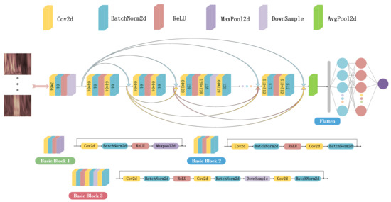 As shown in Figure 7, the ResNet used in this paper consists of one basic residual block 1, four basic residual blocks 2, three basic residual blocks 3, an average pooling layer, and an MLP. These three basic blocks are composed of convolution 2D, batch normalization, ReLU activation function, max-pooling layer, and downsample layer. Moreover, each basic residual block can be considered as a residual block. When gradient propagation problems occur in network training, the network can skip these basic modules to continue training by using quick connections.