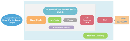 Specifically, as shown in Figure 9, first, fingerprint wavelet feature images were used for the ResNet proposed in this paper. After the training was completed, we picked the best performing model, and retained all parameters of the pretrained ResNet. In the source domain, part of the pretrained ResNet was transferred to the target domain, MLP was newly added, and part of the pretrained ResNet was combined into a new model. The transfer learning method used the prior knowledge of the pretrained model to find the pattern between the real position and the predicted information, thereby predicting the user position. By using a new model based on transfer learning as a fine locator, better positioning accuracy will be achieved.