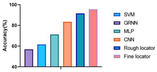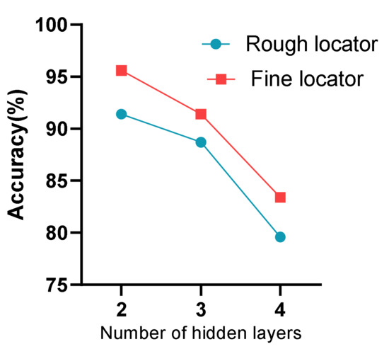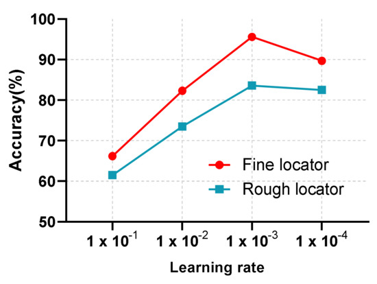 In this experiment, the performance of the rough and fine locator was evaluated. We conducted each experiment 3–5 times and recorded the accuracy of each experiment, and finally picked the best performing model. Initial Lr is an important hyperparameter on CNN that can greatly affect network performance. Therefore, we compared its impact on the rough and fine locators. As seen in Figure 11, the positioning performance of the fine locator based on transfer learning is generally better than the rough locator based on ResNet. The large initial Lr leads to the low positioning accuracy of the two models. This is because the network model cannot effectively converge during training and results in a higher loss value. A small Lr will cause the locator to effectively converge to a local minimum, thereby enhancing the performance of the network. Therefore, based on the experiment results, was picked as the initial Lr.