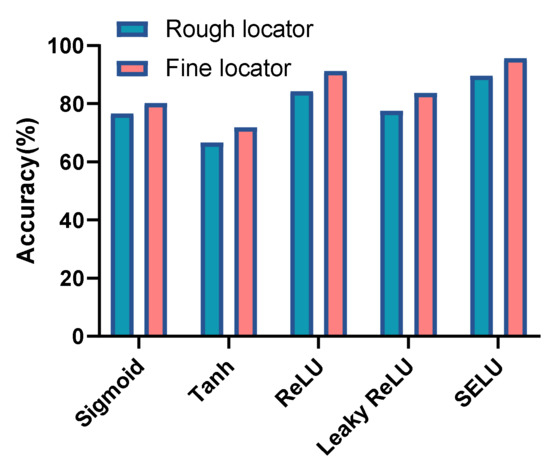 The activation function can convert the linear input of the previous neural network into a nonlinear output, which can enhance the network’s expressive ability and prevent overfitting. Commonly used activation functions are sigmoid, Tanh, ReLU, leaky ReLU, and SELU. When neural networks started to appear, the sigmoid activation function was the most popular. However, it often has a problem with gradient disappearance, and its computational complexity is high. The Tanh activation function is used to solve the problem of the sigmoid. At present, the ReLU function is the most representative activation function. It has the advantage of increasing the nonlinearity of the network and preventing the gradient from disappearing. However, it has a dead ReLU problem: some neurons cannot be activated, which makes the gradient unable to propagate through these neurons. The use of leaky relays further solves the relay problem. Finally, a SELU activation function with high stability is proposed. As shown in Figure 12, since the SELU activation function has good modeling ability, the positioning performance is the best. In most cases, fine locators based on transfer learning perform better than rough locators.