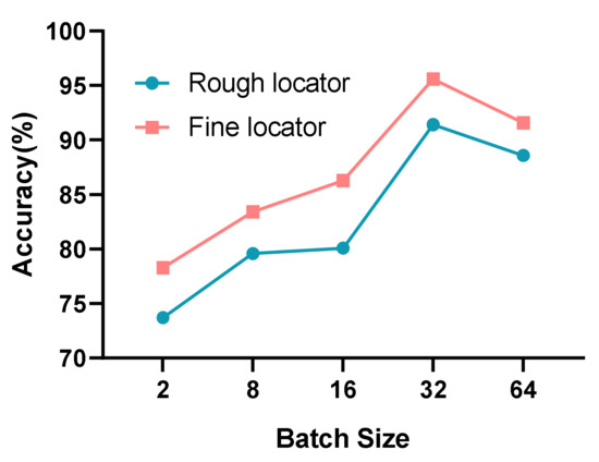 The size of the batch size determines the time required to complete each epoch during the training process and the smoothness of the gradient between each epoch. The choice of batch size determines the direction of the network gradient descent. Increasing the batch size within a reasonable range will improve memory utilization. Excessive batch size will increase training time and affect model performance. As shown in Figure 14, 32 was picked as the proper model batch size. As can be seen from Figure 10, Figure 11, Figure 12 and Figure 13, in most cases, the fine locator based on transfer learning has better positioning accuracy than the rough locator. However, when some parameters are not set properly, their performance will be reduced.