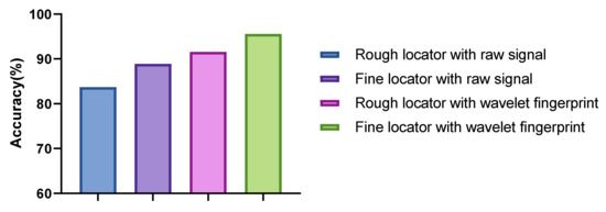 In order to prove that the use of wavelet features can improve the positioning accuracy, we directly used the raw signal data as the input of the DNN in this paper. After completing the signal collection, we divided the signals of each category into 100 segments on average and formed them into a 100-dimensional matrix. Then we randomly shuffled the row vectors of the matrix. Finally, 60%, 20%, and 20% of the data were used as the training set, validation set, and test set, respectively. Because it is a two-dimensional matrix, we can use the proposed DNN work directly with the signal. Figure 16 shows that using wavelet feature fingerprints can effectively improve positioning performance. This is because, compared to the features contained in the raw signal, the signal wavelet features are more delicate and contain more reliable features.