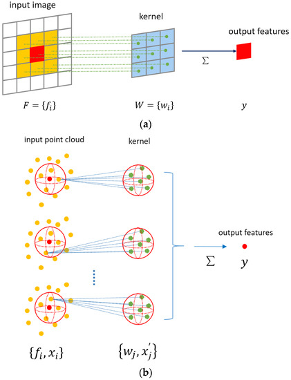 A brief description of the comparison between image convolution and point cloud convolution. (a) Image convolution: Each pixel of the input image corresponds to one kernel element. (b) Point cloud convolution: Each point within the local region is weighted to all kernel elements.