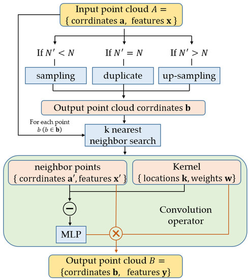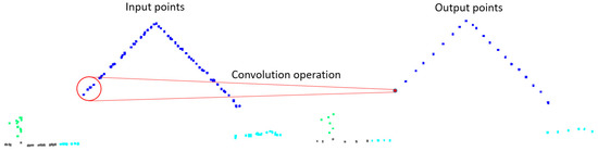 For each output point , we can find its the neighbors in the input points according to a given radius of the spherical neighborhood or the number of neighboring points. Here, the k-nearest neighbor method is used to obtain the neighboring points. Then, according to the convolution operator defined in Section 3.1, the related feature of point is computed. The flow of the convolution layer is shown in Figure 2. Figure 3 shows the simulation of performing convolution layer on a small area of airborne, laser-scanning point clouds.