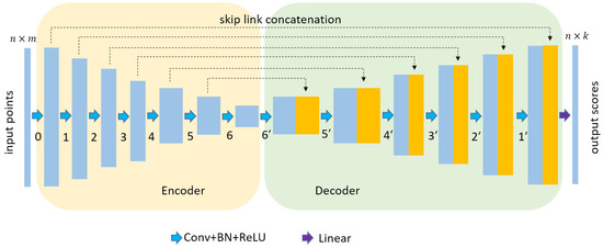 Using the convolution layer constructed above, we can now build a classification network for point clouds. This network is inspired by U-net, which has been successfully applied in image semantic segmentation. The network consists of an encoder and decoder structure, as shown in Figure 4. The encoder part is a stack of several convolutional layers, and the number of points is gradually reduced to obtain multi-level features. We can set the convolution layer number of the encode module according to the size of our GPU and the size of the data volume, which means that our network can be flexibly expanded as needed. There is a batch normalization (BN) and rectified linear unit (ReLU) activation operation behind each convolution layer. The decoder part is a symmetrical stack of convolution layers, which gradually up samples the points to realize the feature propagation. The features of the decoder part are concatenated with skip-linked point features from the encoder part. The last layer uses a point-wise linear layer to obtain the per-point class scores, and the category with the highest score is the classification result of the point. The network architecture of point cloud classification is shown in Figure 4. Table 1 lists the number and feature dimension of input and output points for each layer, where is the number of input points of the network, which can be freely set and changed during the training and testing. However, in order to make full use of the GPU and batch training process, a fixed number of points (such as 8192 points) are usually fed to the network. is the feature dimension of the input points, and is the number of the classification category.