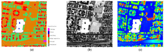 DFC 3D dataset. One tile of the training set (a) colored by classes; (b) colored by intensity; (c) colored by height.