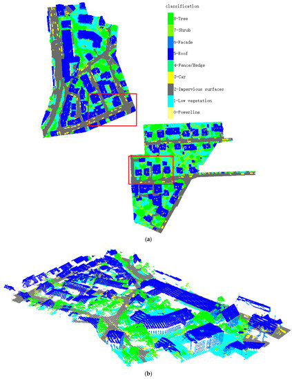 We evaluated the proposed methods, using ISPRS Vaihingen 3D data and 2019 IEEE GRSS DFC 3D data. The Vaihingen 3D data were provided by the International Society for Photogrammetry and Remote Sensing (ISPRS) 3D-Semantic Labeling Contest [25]. Both the airborne LiDAR point cloud data and corresponding georeferenced IR-R-G imagery were provided. The airborne LiDAR point cloud data were captured by a Leica ALS50 with a mean flying height 500 m above Vaihingen, Germany. The median point density of the dataset was about 6.7 points . The dataset includes a training set with 753,876 points and a test set with 411,722 points, as shown in Figure 5. In order to objectively evaluate the generalizability of the classification model, the test set was only used in the final evaluation. A validation set was needed to tune the hyperparameters and select the best model for training. Therefore, in data preprocessing of the Vaihingen 3D data, we split the original training data into a new training set (outside the blue box) and a validation set (inside the blue box), as shown in Figure 5a. The point clouds of the training and validation sets were labeled with nine semantic categories: powerline, low vegetation, impervious surfaces, car, fence/hedge, roof, facade, shrub and tree.