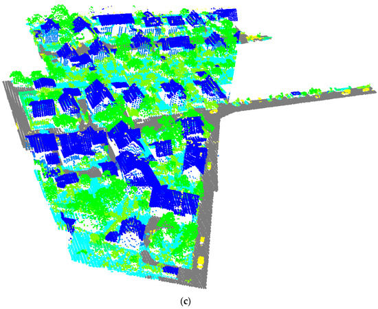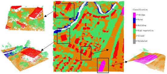 In Figure 10, we present the classification result of our method on one tile of the DFC 3D test set. Different kinds of objects are displayed in different colors. The results showed that our method correctly classified most of the points. Although the density of the point cloud was not large, the different categories were well distinguished and recognized, especially the minority categories, such as water and bridge. We obtained an OA of 97.74% and mIoU of 92.02% for the DFC 3D test set.