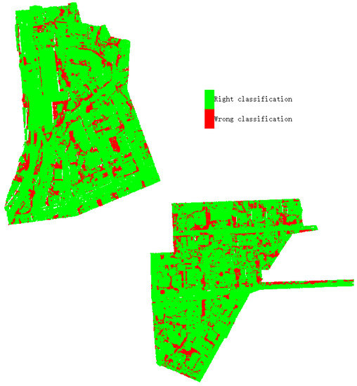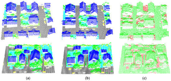 After data preprocessing, the hyperparameters were tuned and the best model was selected using the training and validation data. Then, the training data and validation data were combined to train the final network. The test data were fed to the final network to obtain the predicted label for each point. The classification result of our method on the Vaihingen 3D test set is shown in Figure 7. The classified points are displayed in different colors. Figure 8 shows the error map, which was obtained by comparing the predicted labels with the reference labels. Points with correct classification are displayed in green, and the red points indicate incorrect classification. In order to further observe the performance of our method, we chose two blocks (the red boxes in Figure 7) in the test set to show the details, as shown in Figure 9. Figure 9a shows our result of two blocks, Figure 9b shows the ground truth and Figure 9c shows the error map of the corresponding area. The results showed that most of the points were classified correctly. The OA of our method was 84.6% and the average F1 score was 71.4%.