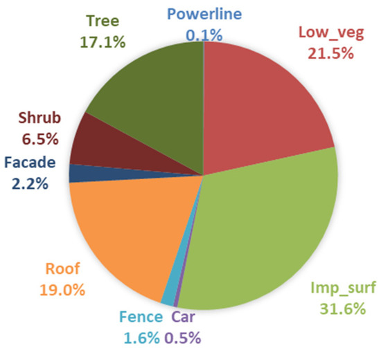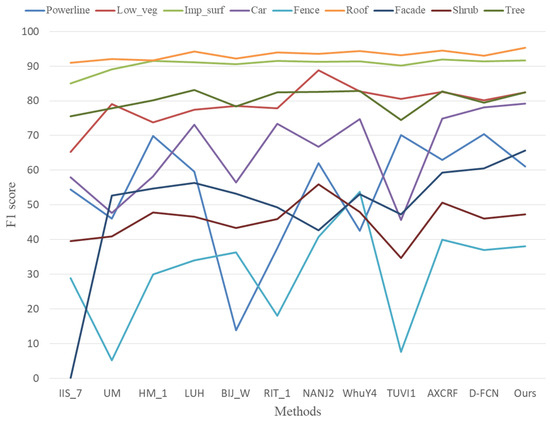 In order to analyze the performance of these methods in each category more intuitively, Table 5 was transformed into Figure 11. The number of points in each category of training set in Table 2 were also converted into percentages, and then transformed into Figure 12. Through the analysis of Figure 11 and Figure 12, we found that although the number of points in roof was not the largest, accounting for only 19% of the training set, all methods performed best on roof. Our method achieved the highest F1 score, which is 95.3%. All methods performed well on Imp_surf, which had the most points in the training set, and the F1 score was basically around 90%. They also had good performance on Low_veg and Tree, the F1 score basically reaching about 80%. These four categories had a large number of points in the training set, which enabled them to achieve higher classification accuracy. The experiments showed that, regardless of whether the method used was based on traditional machine learning or deep learning, higher classification accuracy could usually be obtained for those categories which accounted for a larger proportion in the training data. Surprisingly, although powerline and car accounted for a small proportion in the training set, some methods still performed well. The F1 score of our method on car was even close to 80%. The F1 score of most algorithms on facade was basically 60. The performance on fence and shrub was the worst. This is mainly because there were few points in these two categories, and their characteristics were very close to each other, which made it very difficult to distinguish them.
