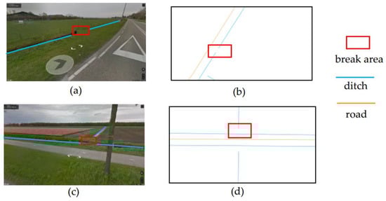 Breaks between ditches: (a) a break in the ditch of real image data and (b) map data, (c) a break at the junction of ditches of real image data, and (d) map data.
