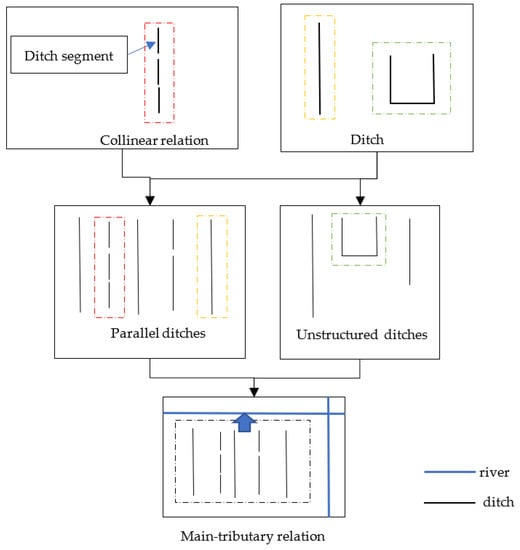 The model incorporated three relations. (1) Collinear relation: it was defined to extract a complete ditch from ditch segments, converting the m-n problem into the 1-1 problem. (2) Parallel relation: parallel distribution is a typical pattern of ditches and easily perceived by human visual perception. (3) Main-tributary relation. Ditches have a close affiliation with rivers to drain water considering the function of ditches. Additionally, unstructured ditches have a main-tributary relation with rivers. The concept of an unstructured ditch has not been properly explained. Hence, this paper focuses on the main-tributary relation between parallel ditches and rivers.