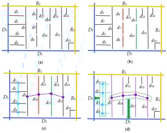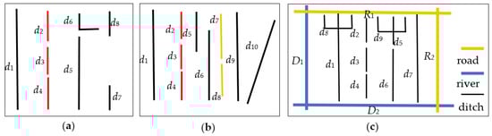 The first part is called ditch grouping. Roads and rivers have a strong separation effect on ditches. The region was divided into several meshes by the river network and main road network. Ditches were grouped by mesh based on containing relation. Therefore, the meshes surrounded by main roads and rivers were regarded as grouping units of ditches; ditches in the same mesh were treated as a group. Figure 5a shows that the mesh is constructed by main roads (R1, R2) and river segments (D1, D2). Moreover, ditches (d1–d15) were formed into a group.