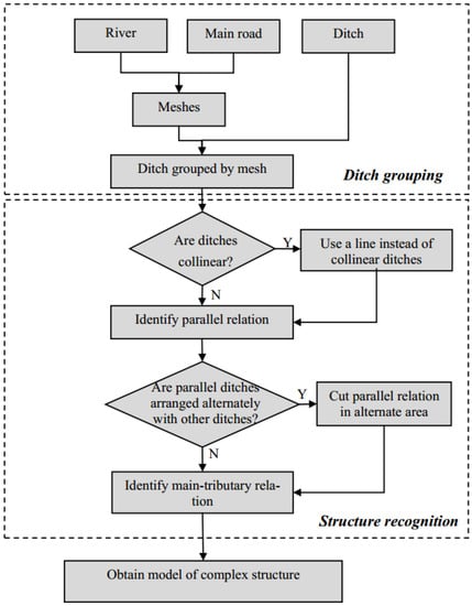 Pattern recognition is an important issue for data enrichment and map generalization. This paper demonstrated a model to describe the complex pattern of mix-distributed ditches. Three relations—collinear, parallel, and main-tributary—were defined to describe the complex structure of ditches. Collinear relation combined ditch segments via the principle of integrity, maintaining the continuity of ditch. Parallel relation—the main spatial pattern in farmland—was used to combine discrete similar parallel ditches into a group. Main-tributary relation repaired the connection between parallel ditches and rivers. The three relations describe complex ditches at different levels. Moreover, a complex pattern of ditches was detected from the primary level to high level, which is in the order of collinear, parallel, and main-tributary. The experimental results show that the proposed method can detect the main topology and distribution characteristics of ditches and describe their structure in an orderly manner.