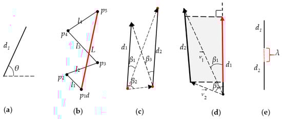 - Distance between ditches, λ: It is the minimal distance between adjacent ditches in the candidate group, i.e., the length of the red dotted line between d1 and d2 in Figure 6e. The range of λ was (0, +∞). The value of λ close to 0 implies that these ditch segments are closely aligned, similar to a line.