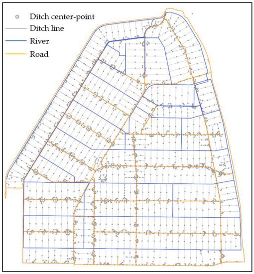 The Netherlands has a large and complex man-made drainage system; its ditches form a typical agricultural landscape. The pattern of ditches should be identified first to enrich the ditch data and furtherly serves for automatic generalization. Therefore, we used the topographic datasets at the scale of 1:10k from Noordoostpolder in the Netherlands. There are ditches, rivers, and roads (see Figure 7). Different ditches were also represented by center points in gray. We observed that many ditches were surrounded by rivers and roads. Moreover, they were discontinuous due to many breaks.
