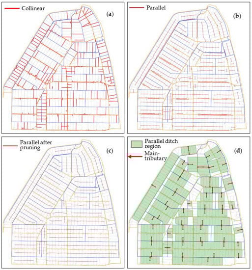 We detected 325 collinear ditch groups in Figure 8a. There were 132 parallel ditch groups in Figure 8b and 54 parallel groups after removing an alternate parallel ditch group with short length in Figure 8c. Finally, we identified 61 groups of main-tributary relations between these parallel group and river segments in Figure 8d.