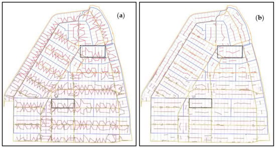 Different main-tributary relations: (a) the main road breaks ditches into different groups. (b) main-tributary relation between ditches. Among them, red lines were affiliated ditches in main-tributary relations.